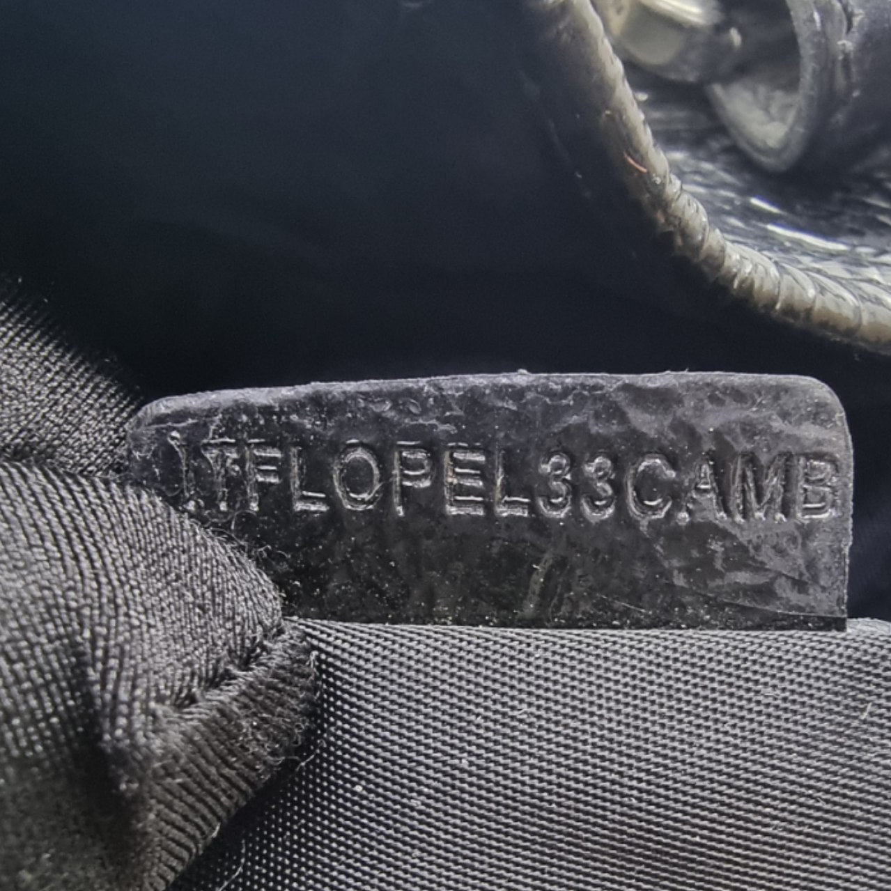 Exterior : The nylon have discoloration. The patent leather trim have faint rubbing and the leather trim along the the opening have creasing throughout. The double handles have scuffings and the hardware have scratches. Overall in good condition with snap closure and double flat handles.