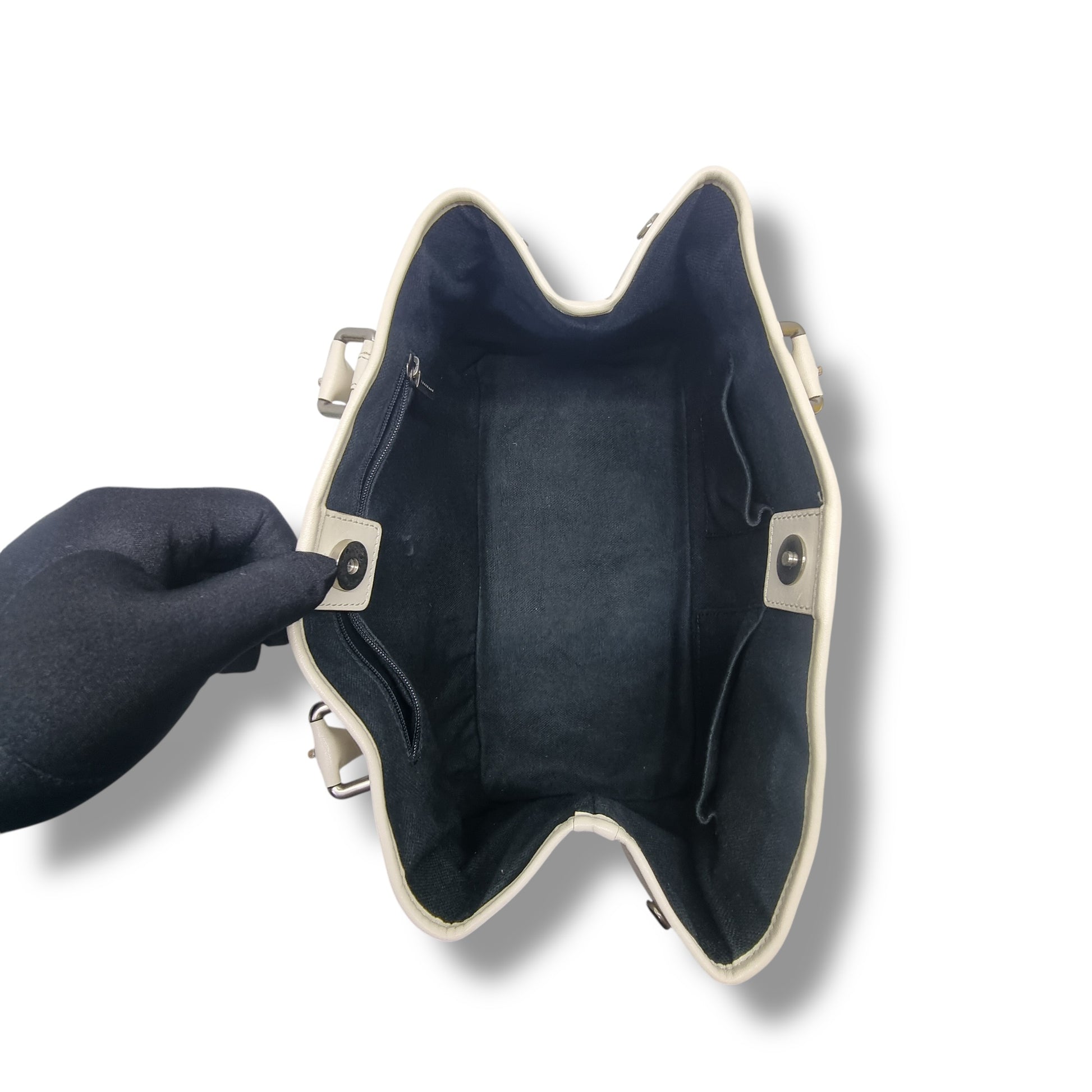 Exterior : Shows signs of wear, the canvas has bloated and also rubbing and creasing on the leather. Darkened on the handles grom been held. Overall in good condition with snap closure, expandable side with press stud fastening and double rolled handles.