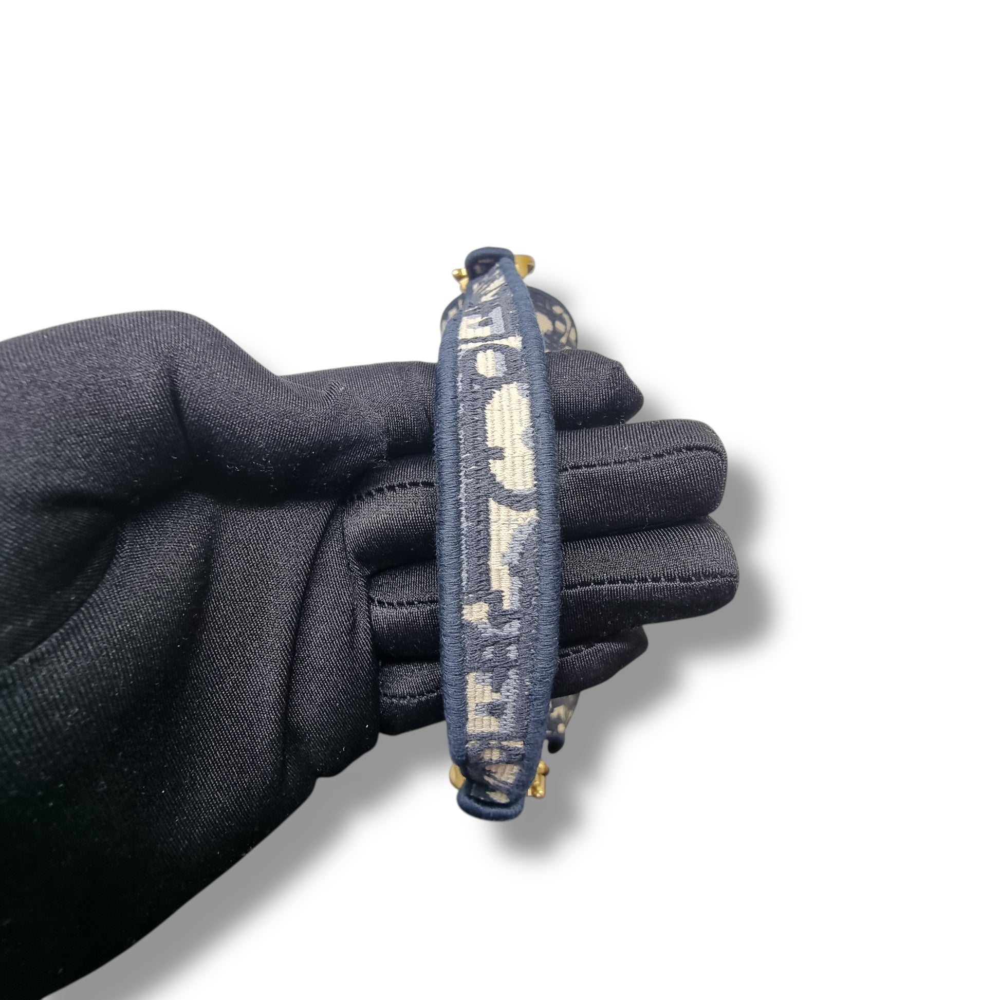 Exterior : The exterior is in excellent condition with faint wear and areas of slight darkening. The hardware has a deliberately antiqued appearance and is in excellent condition with hairline scratches. It feature a D stirrup clasp with magnetic strap closure, CD signature on the strap and back 1 slip pocket.