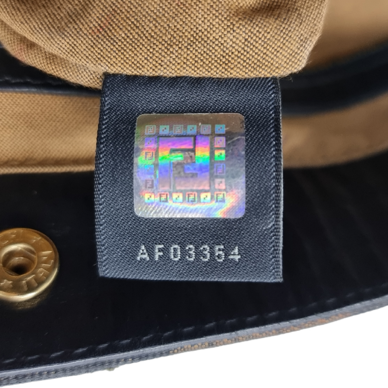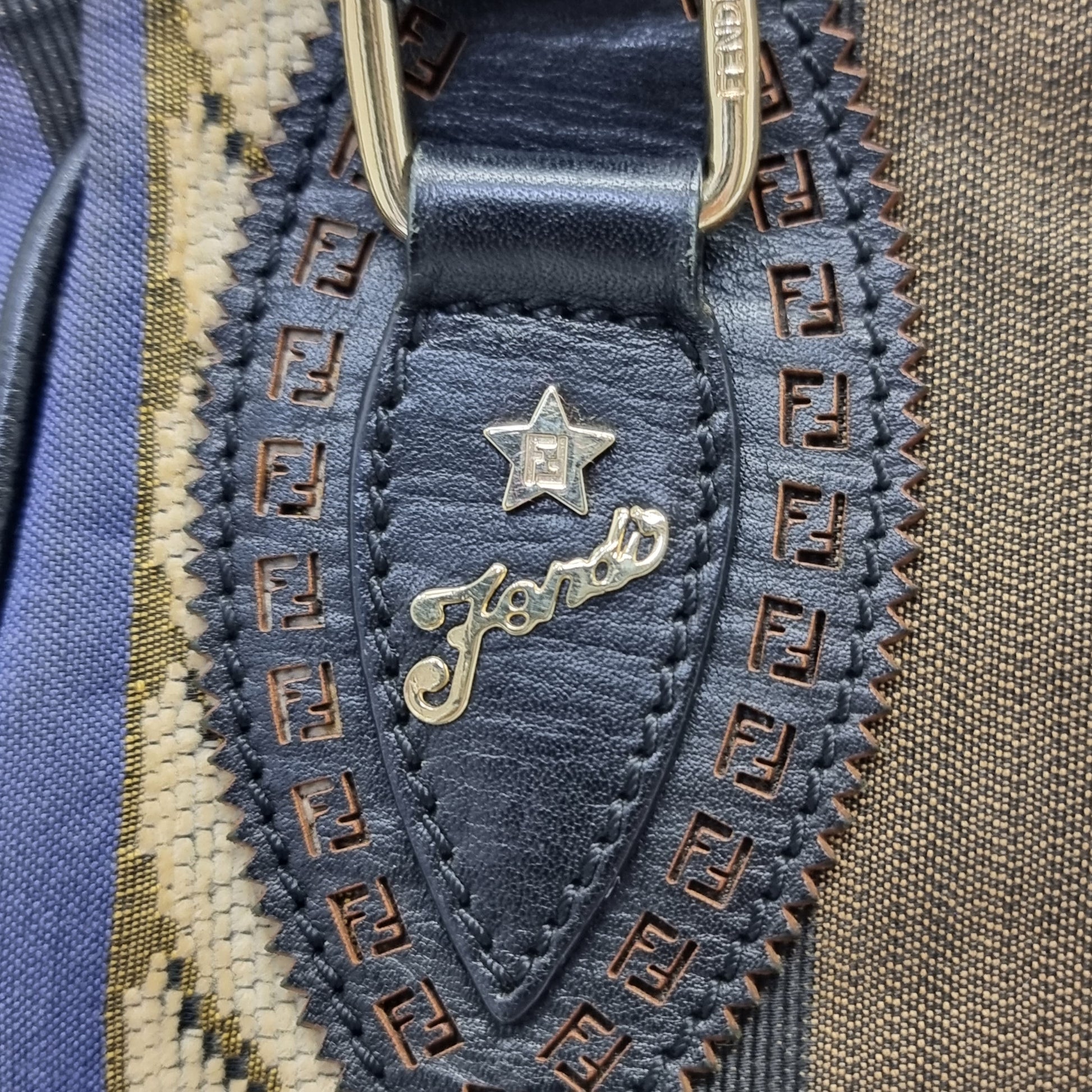 Exterior : Very gently used with slight rubbing at the corners. The hardware is bright and no tarnished. Overall in excellent condition with double snap button closure, double leather rolled handles, Fendi logo around leather lining.