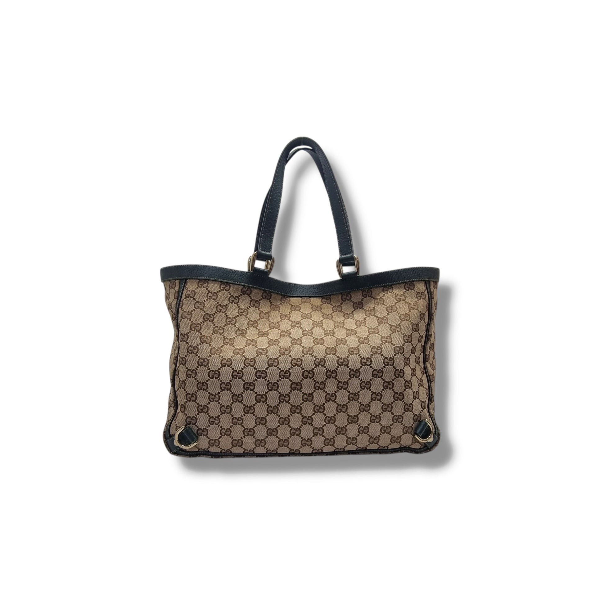 Exterior : The canvas is clean but the leather trim has some minor scuffs and creasing. Hardware has scratches and faded. Overall in good condition with canvas body with leather trim, open top with magnetic snap closure and double flat leather handles.