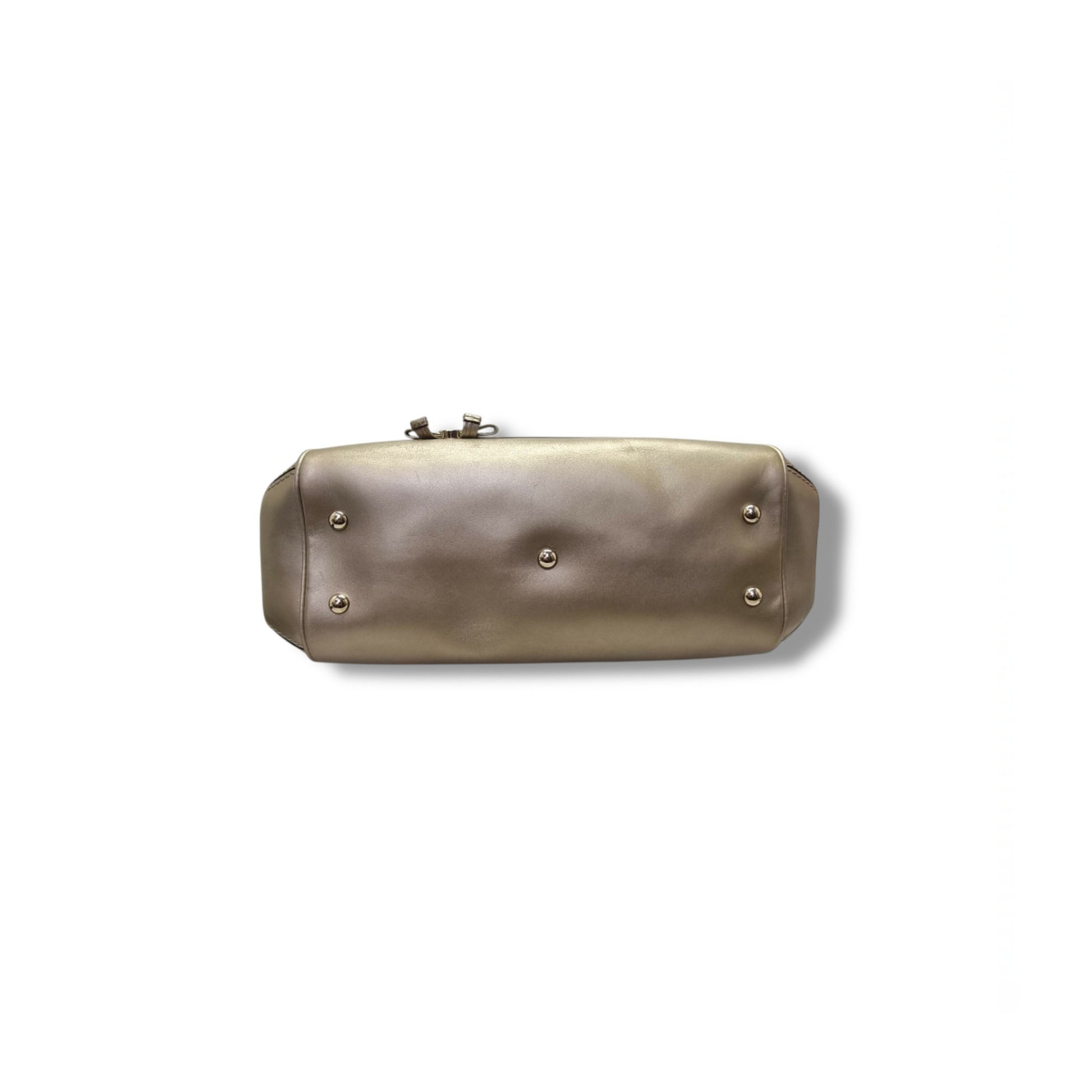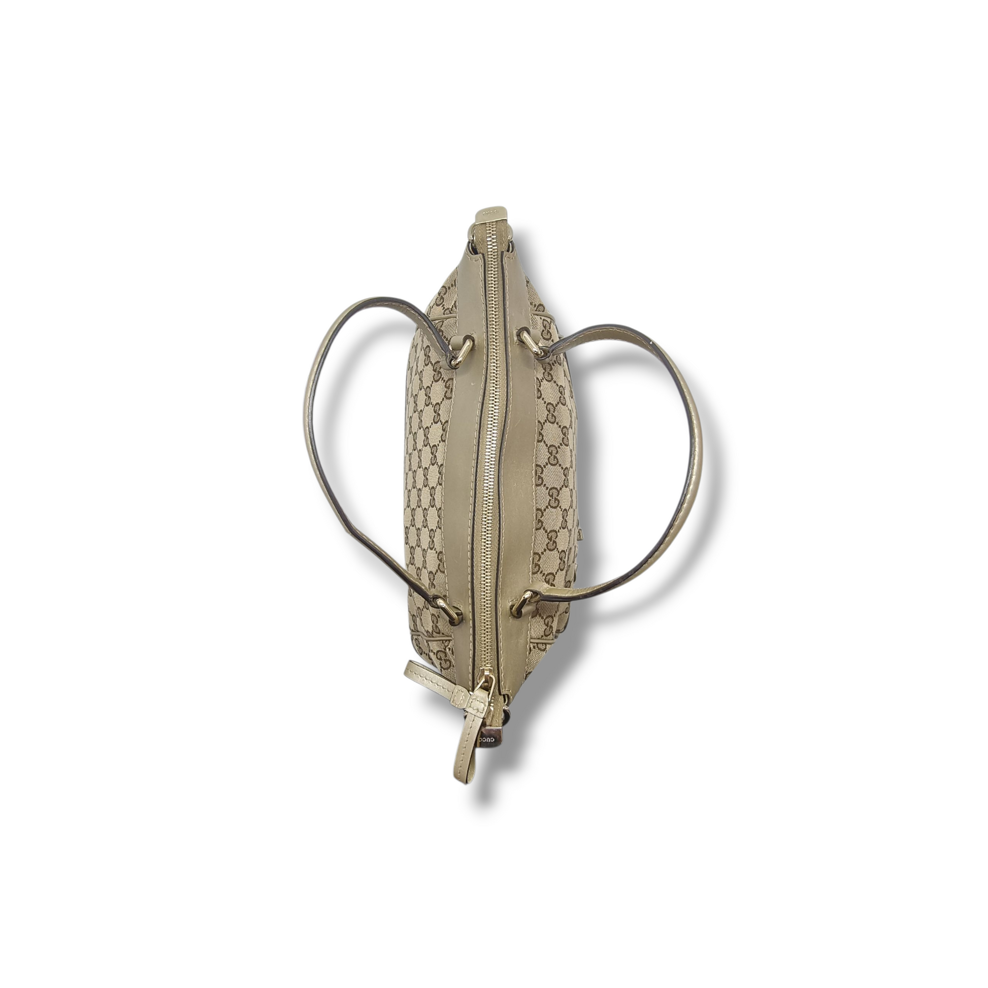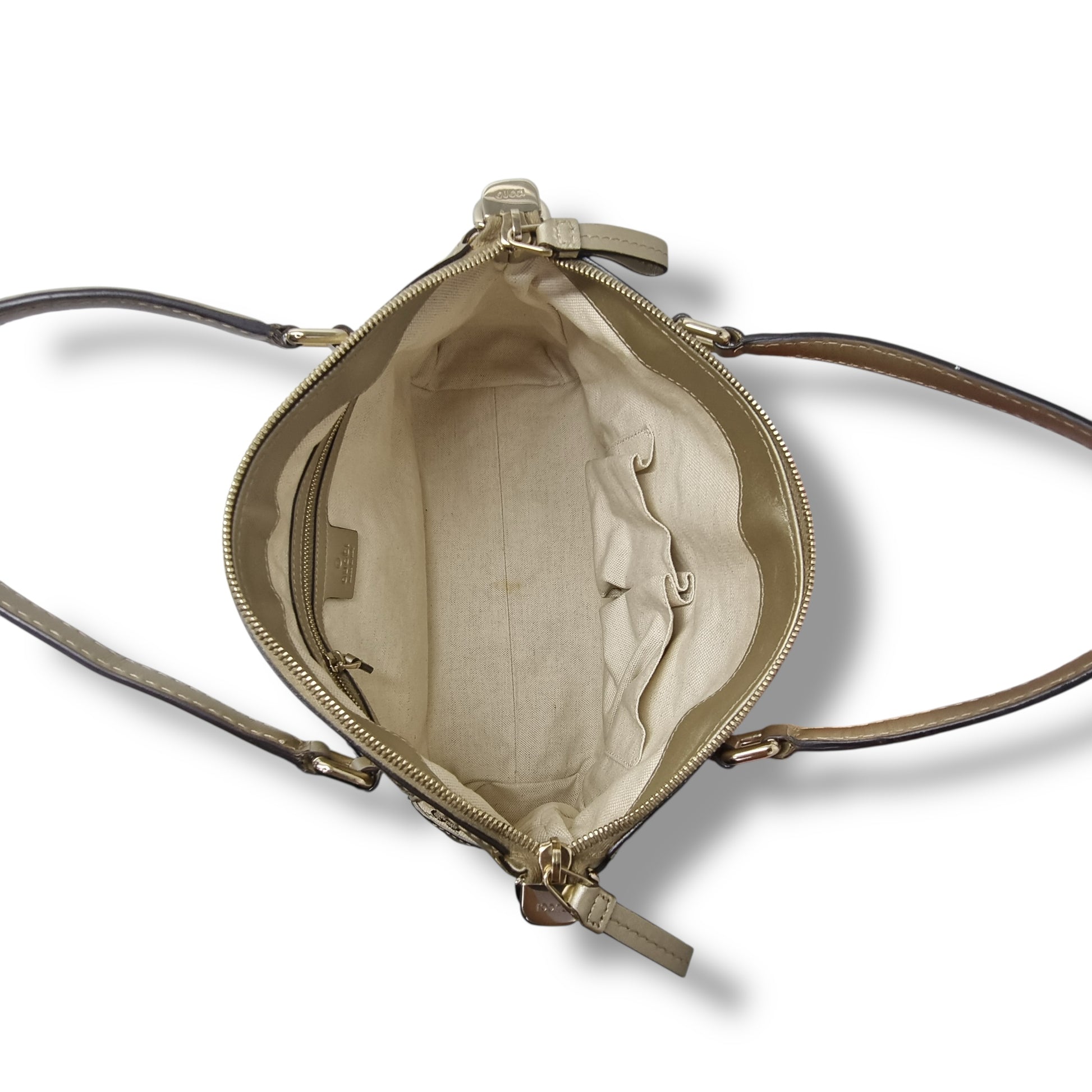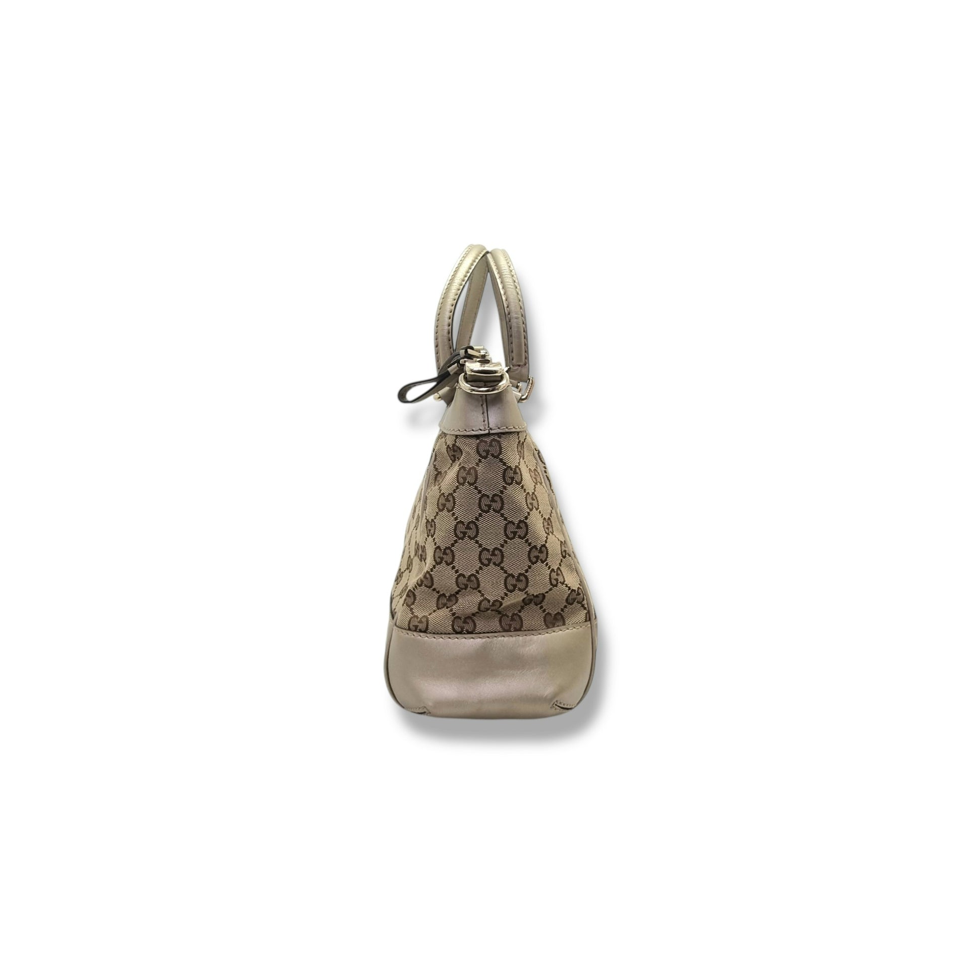 Exterior : The canvas is clean throughout but the leather has scratches and slight creasing. Hardware remain bright. Overall in very good condition crafted with signature GG canvas and leather, petite bow on the front, zip closure and double handles two handles, goldThe striking bag has-tone hardware, a canvas-lined interior and a petite bow on the front. With a timeless design, this bag will elevate every outfit.