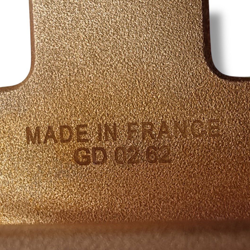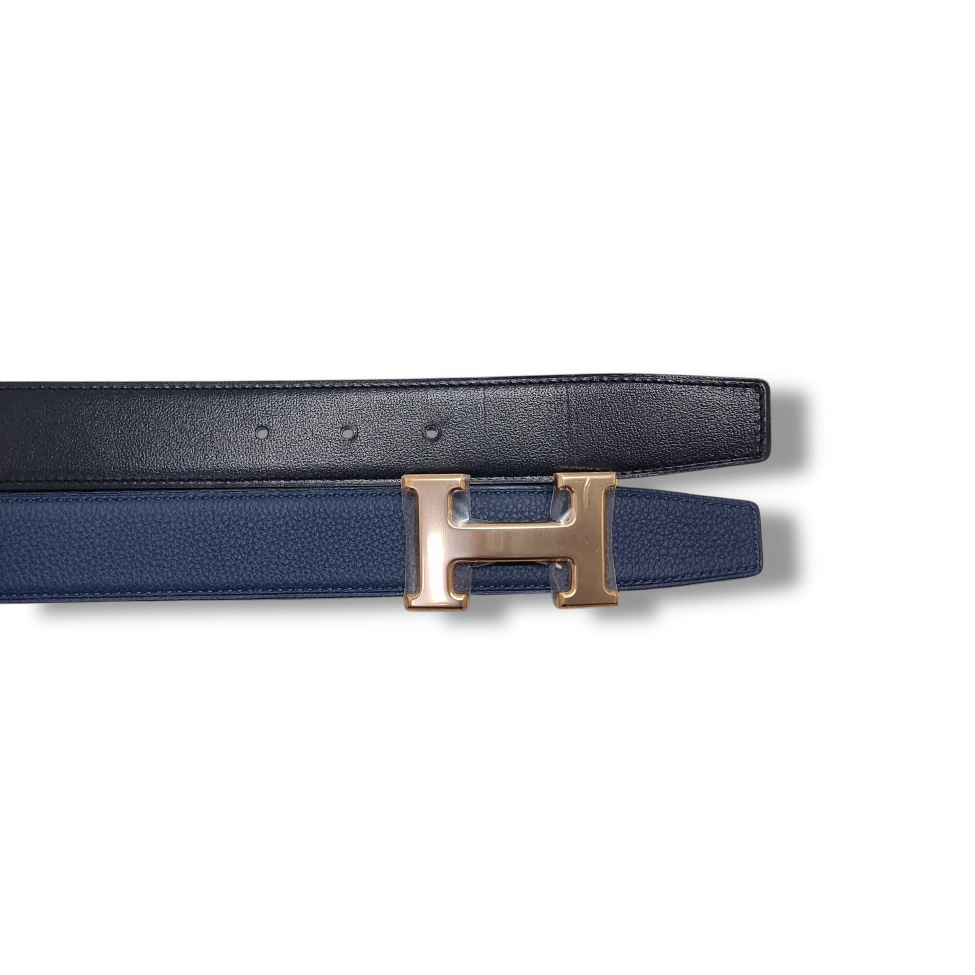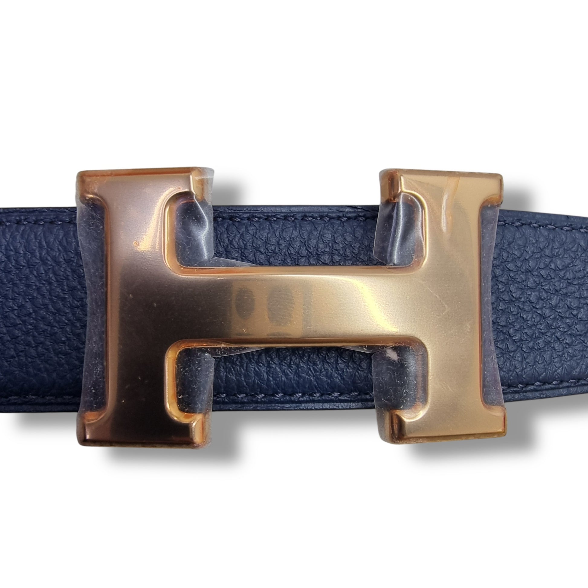 Description : H belt buckle in rose gold plated metal. Reversible leather strap.