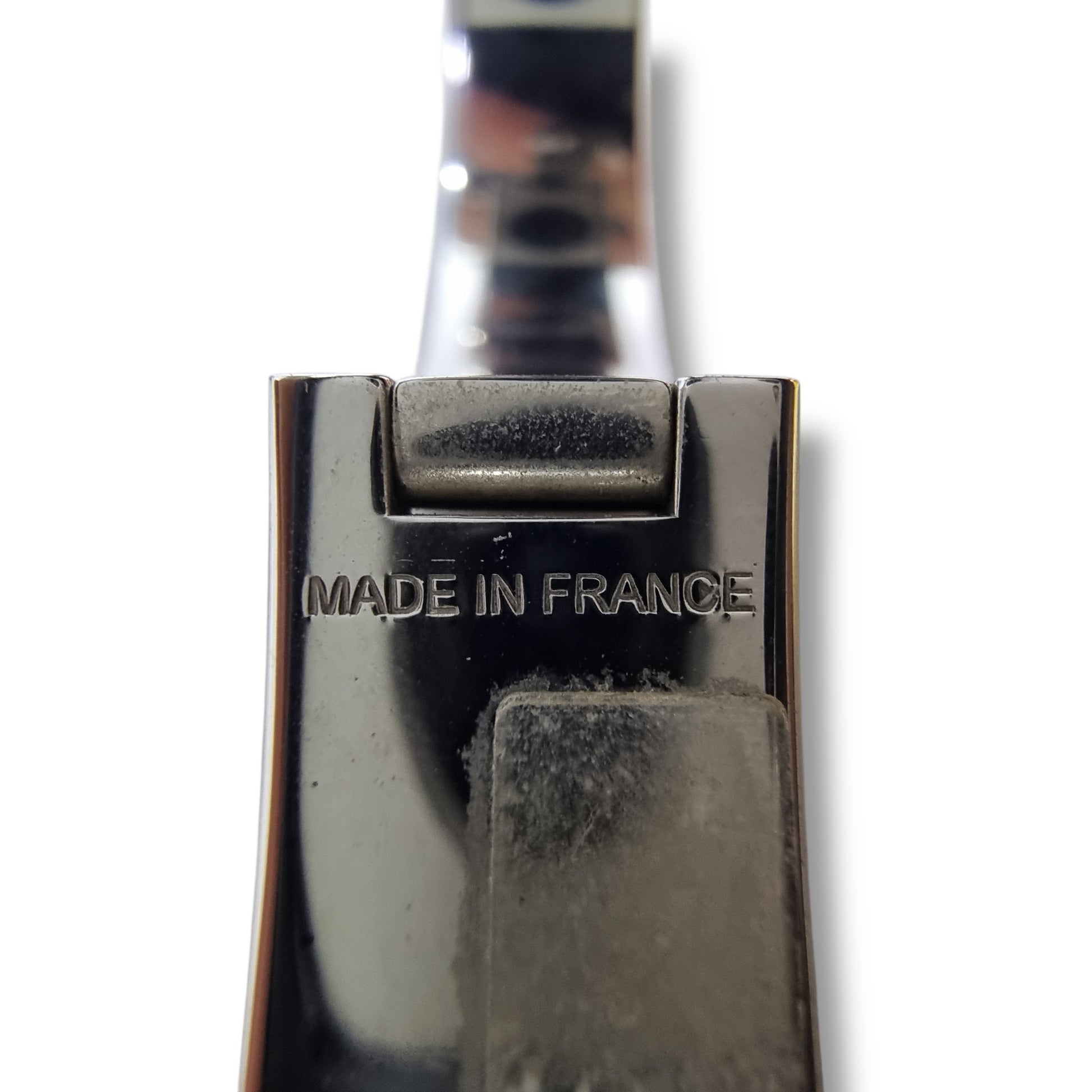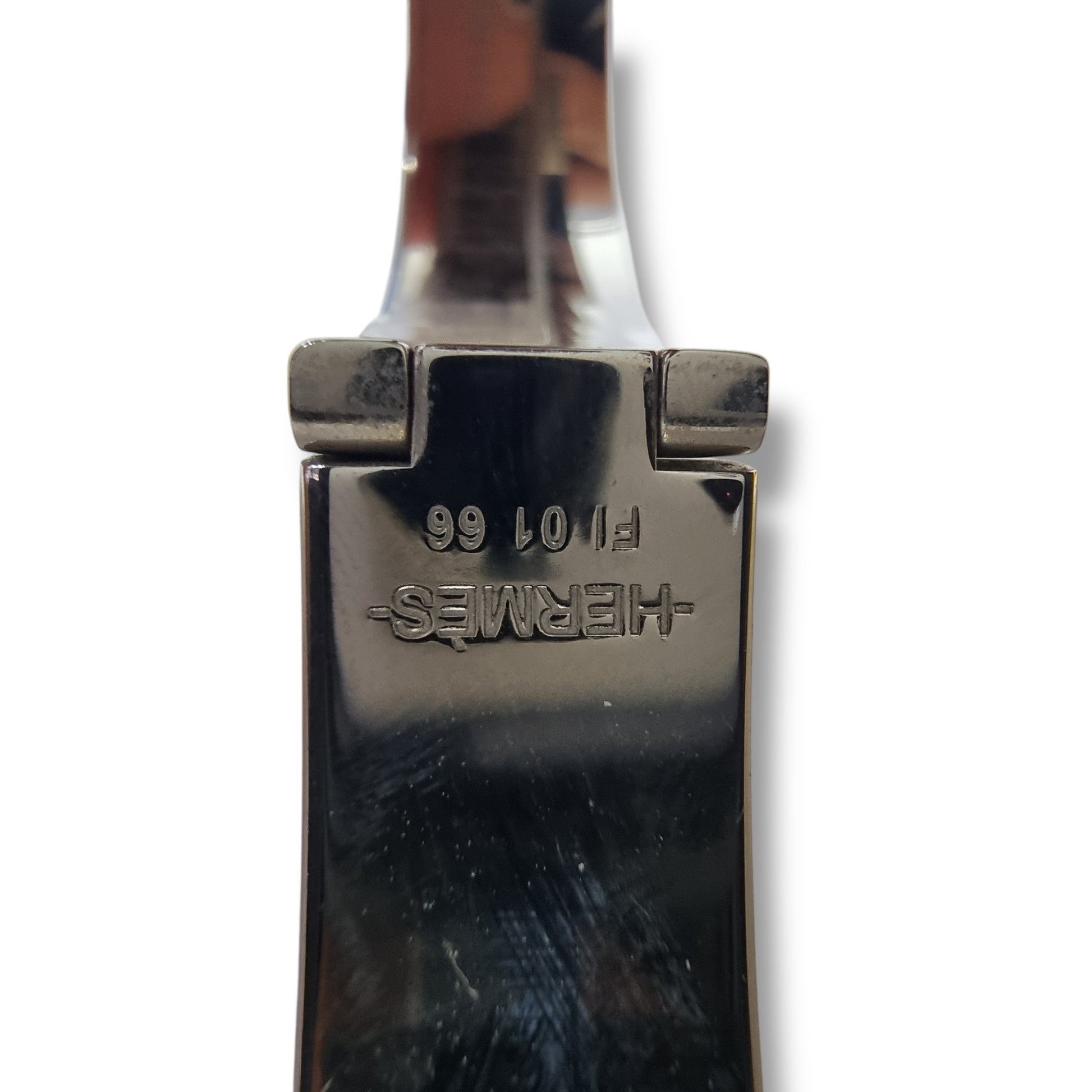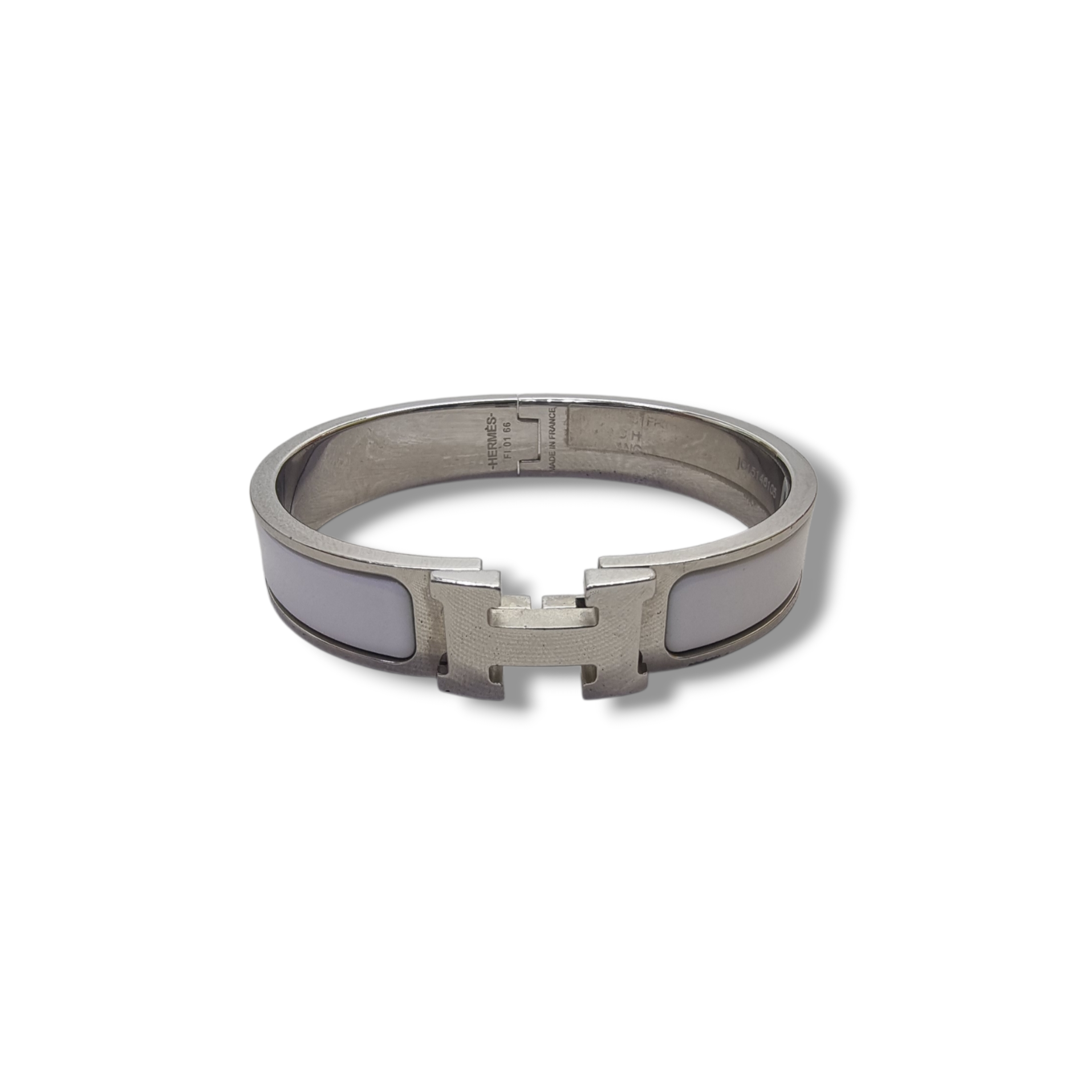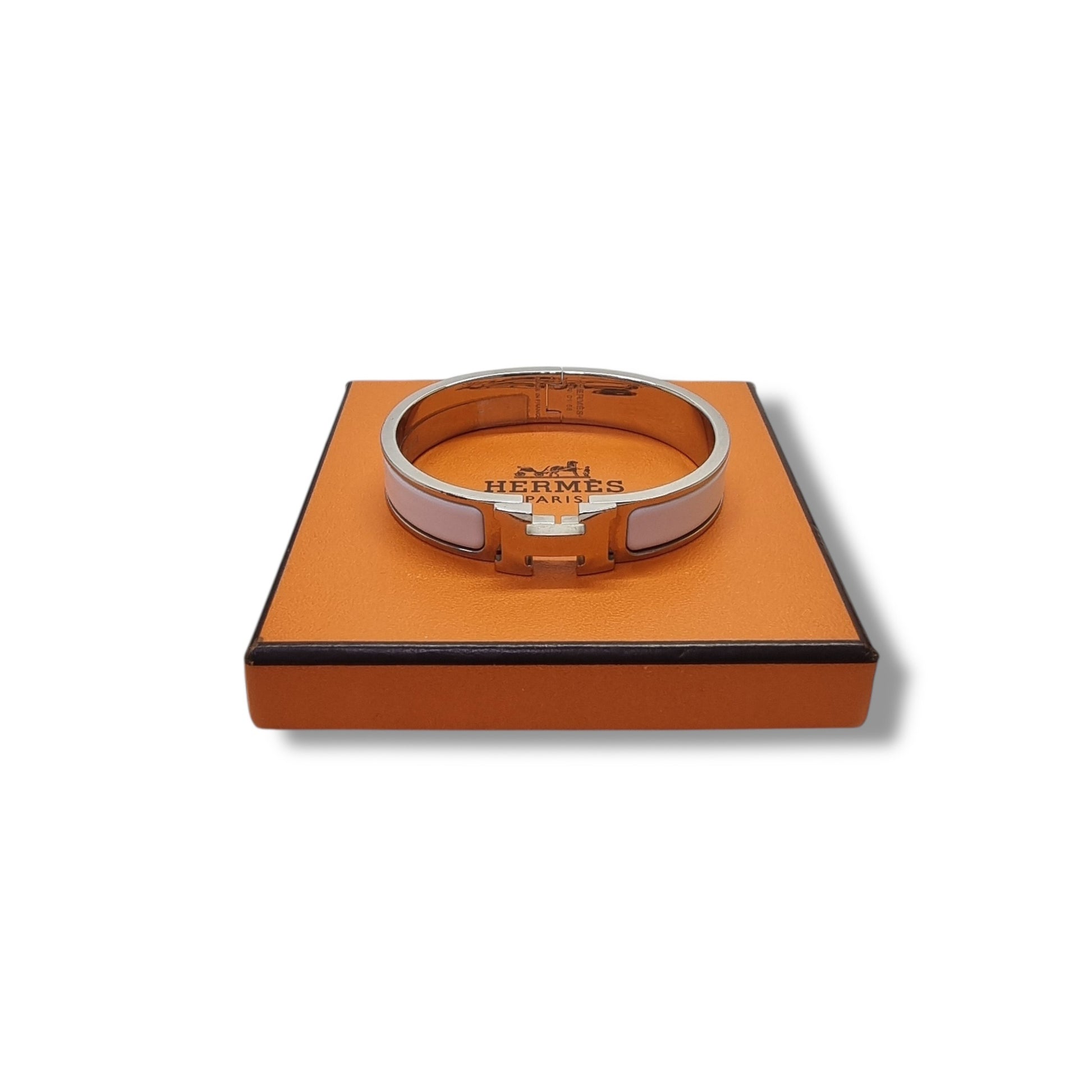 Exterior : It has small marks and hardware has hairline scratches on the surface. Overall in very good condition. Featuring a narrow bracelet in plain enamel with platinium plated hardware. It opens and closes to a toggle clasp which reveals an "H".