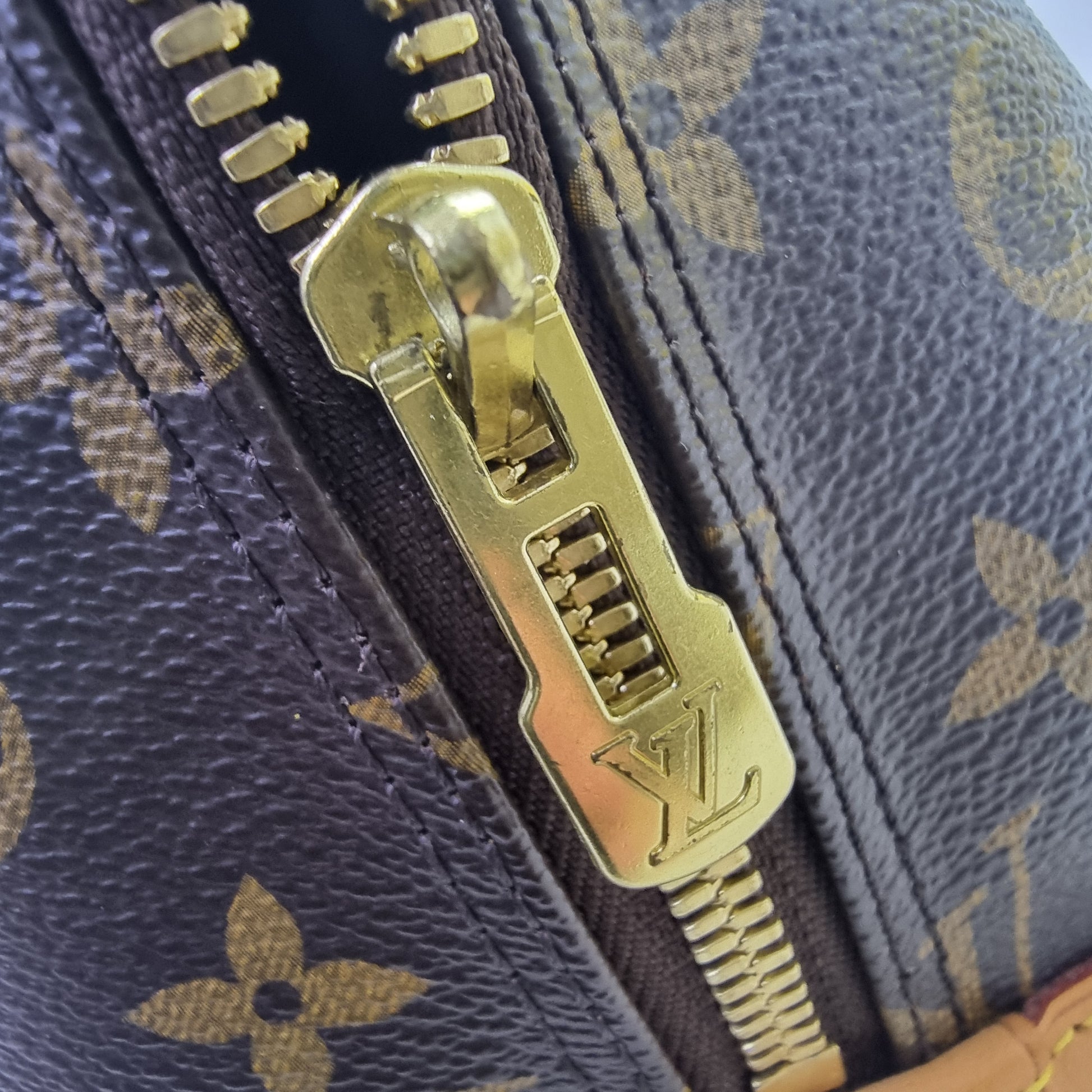 Exterior : The canvas is clean and nice but the leather at the bottom has slight scratches, minor stains as well as discoloration. The handle has darkened as well as slight marks from being held. Overall remain in excellent condition with 2 way zip closure, double rolled handles, padlock, keys belt