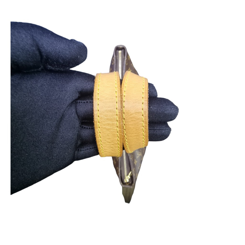 Exterior : The canvas is clean and nice but the leather base shows wear throughout with water marks, scuffs, stains and discoloration. The tops of the handles have darkened due to wear. Overall in good condition with top zip closure, double flat pockets.