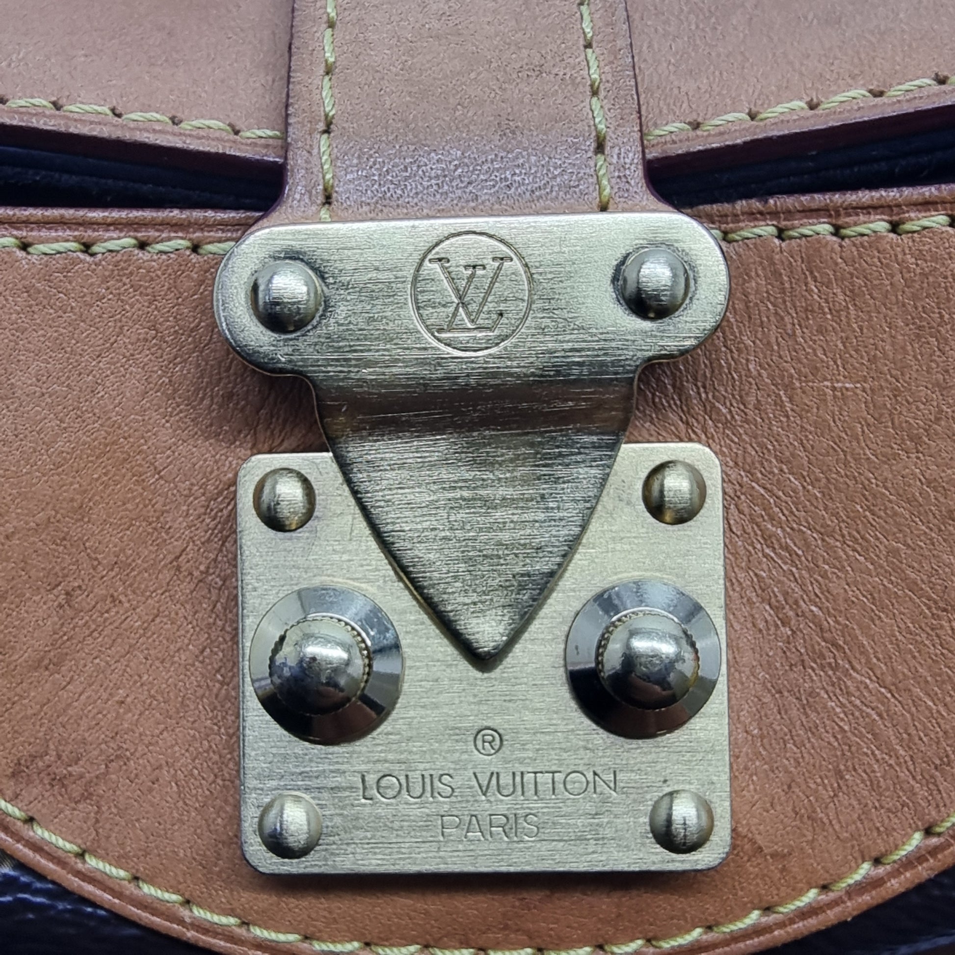 Exterior : The canvas is clean and nice. The leather has developed a dark patina, water marks, stains and creasing. The strap has darkened, water marks and slight creasing. Hardware has hairline scratches but is still bright. Overall in good condition with iconic S-lock clasp closure.