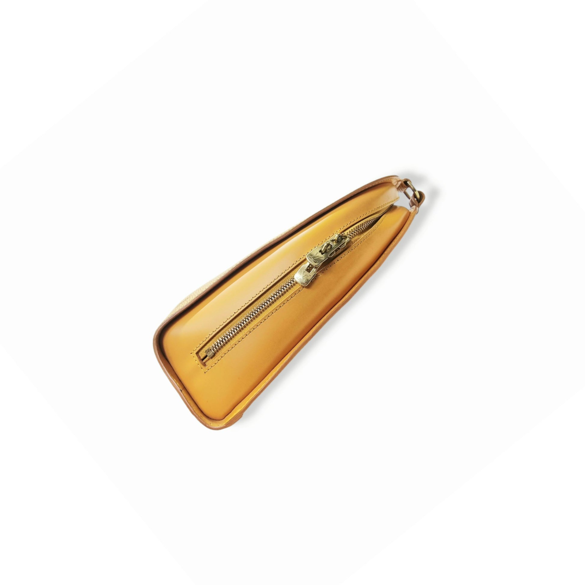 Exterior : Leather is in good shape but discoloration. Hardware have tarnished. Strap have light creasing. Overall in good condition with 2 way zip closure, flat back adjustable strap and back 1 zip pocket.