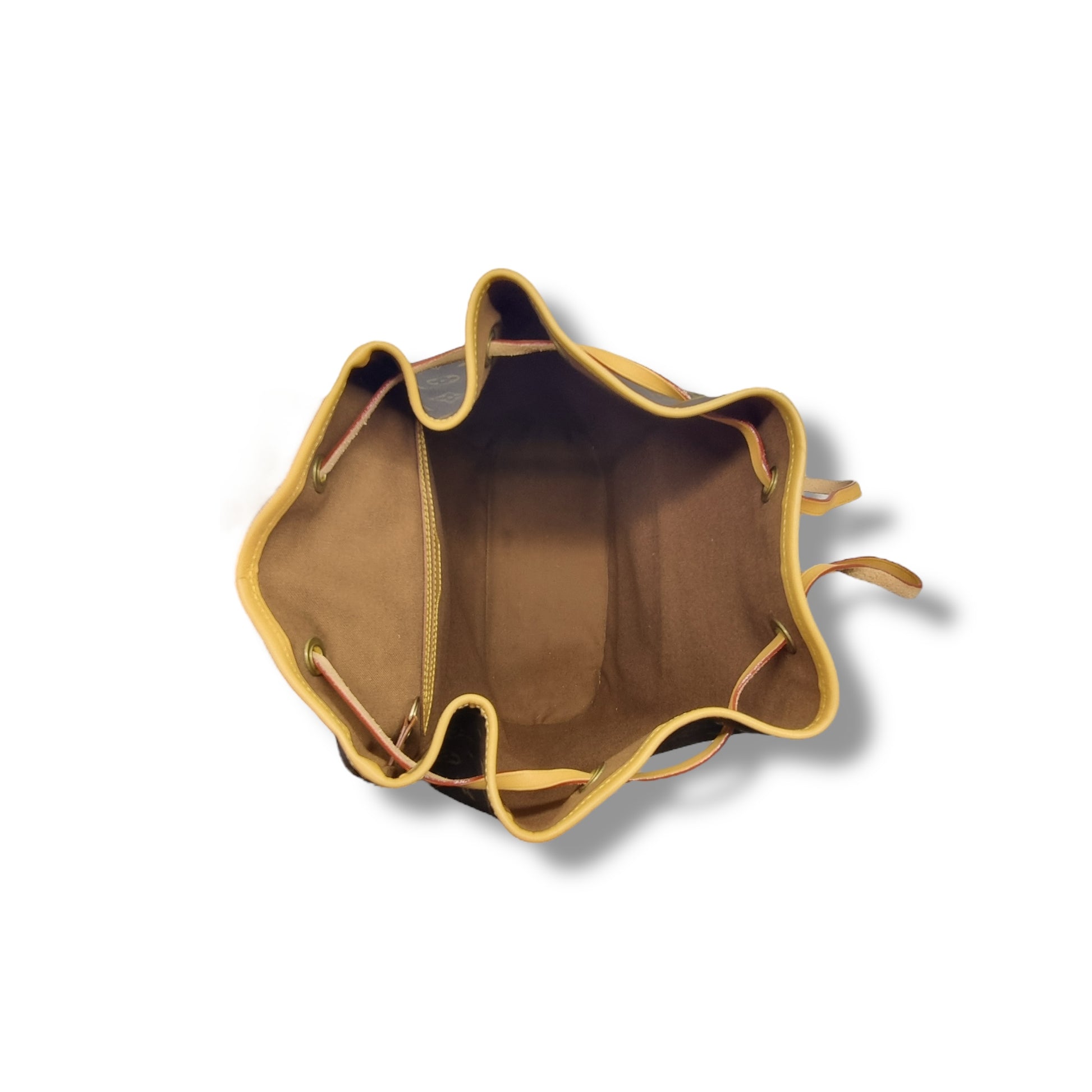 Exterior : The canvas is clean throughout but the the leather has water marks, spots, scratches and some parts has darkened. Hardware has loss of gold tone. Overall in very good condition with leather cinched top with flap closure and buckle, adjustable canvas backpack strap with leather trim and front zipped pocket.