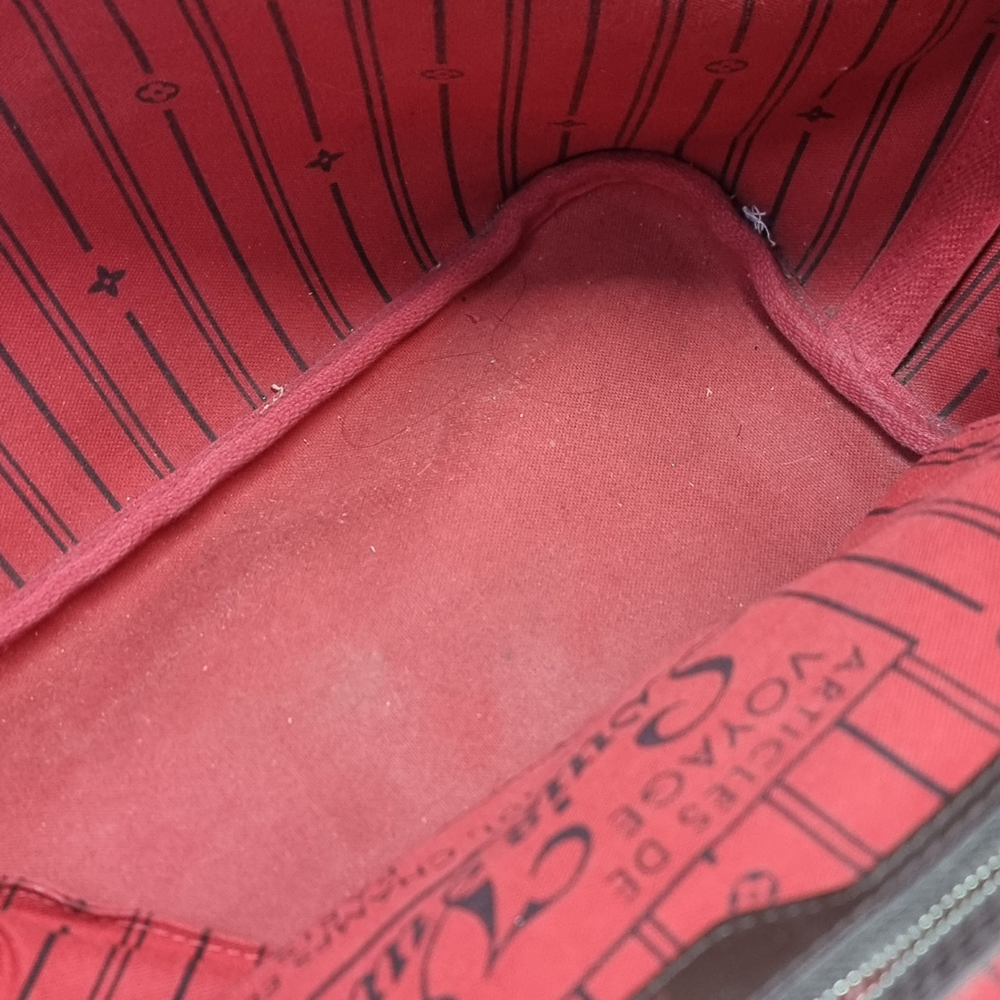 Interior : Ripping and stains inside pocket. Overall in good condition with flat textile lined zip pocket, striped textile lining.