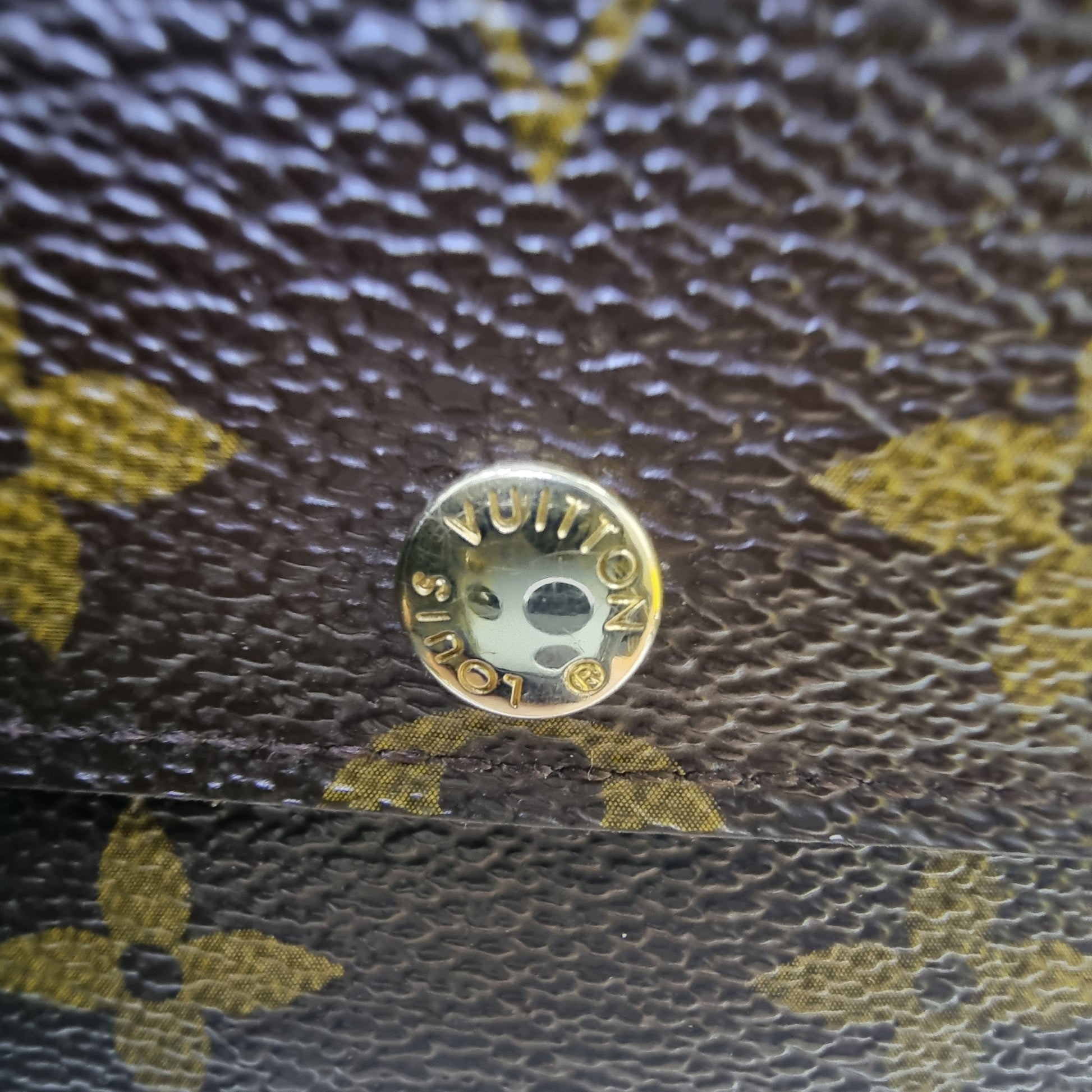 Exterior : The leather is clean with light surfaces scratches. The hardware has slight scratches. Overall in good condition with snap button closure, 4 card slots under the flap.