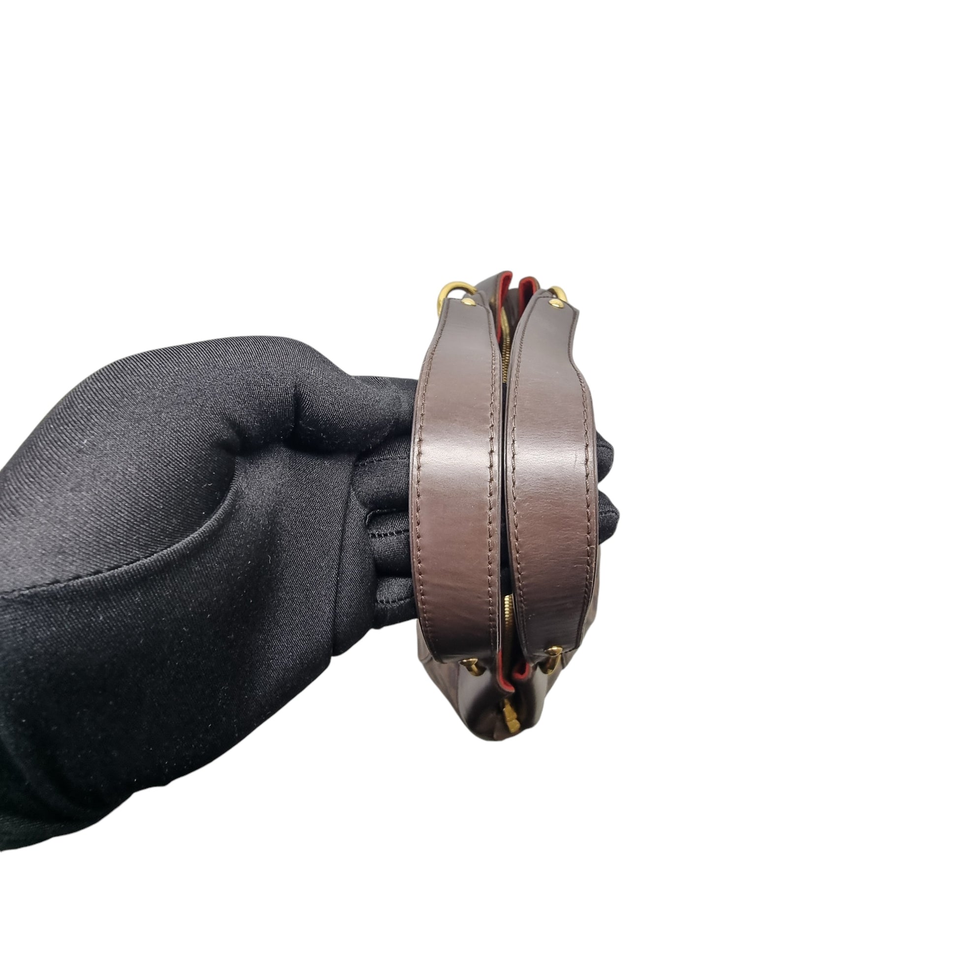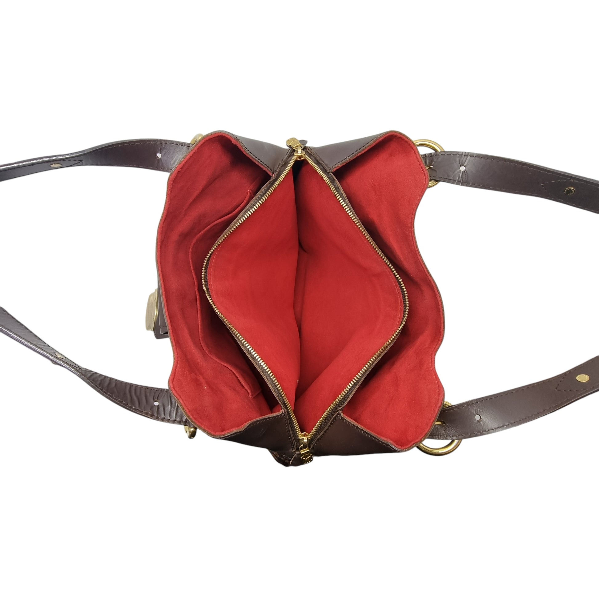 Exterior : The leather is clean and nice but the leather top handles show noticeable rippling and the hardware has surface scratches. The leather panel at the top has lightly scratches . Overall in good condition with flap tab closure, double adjustable handles