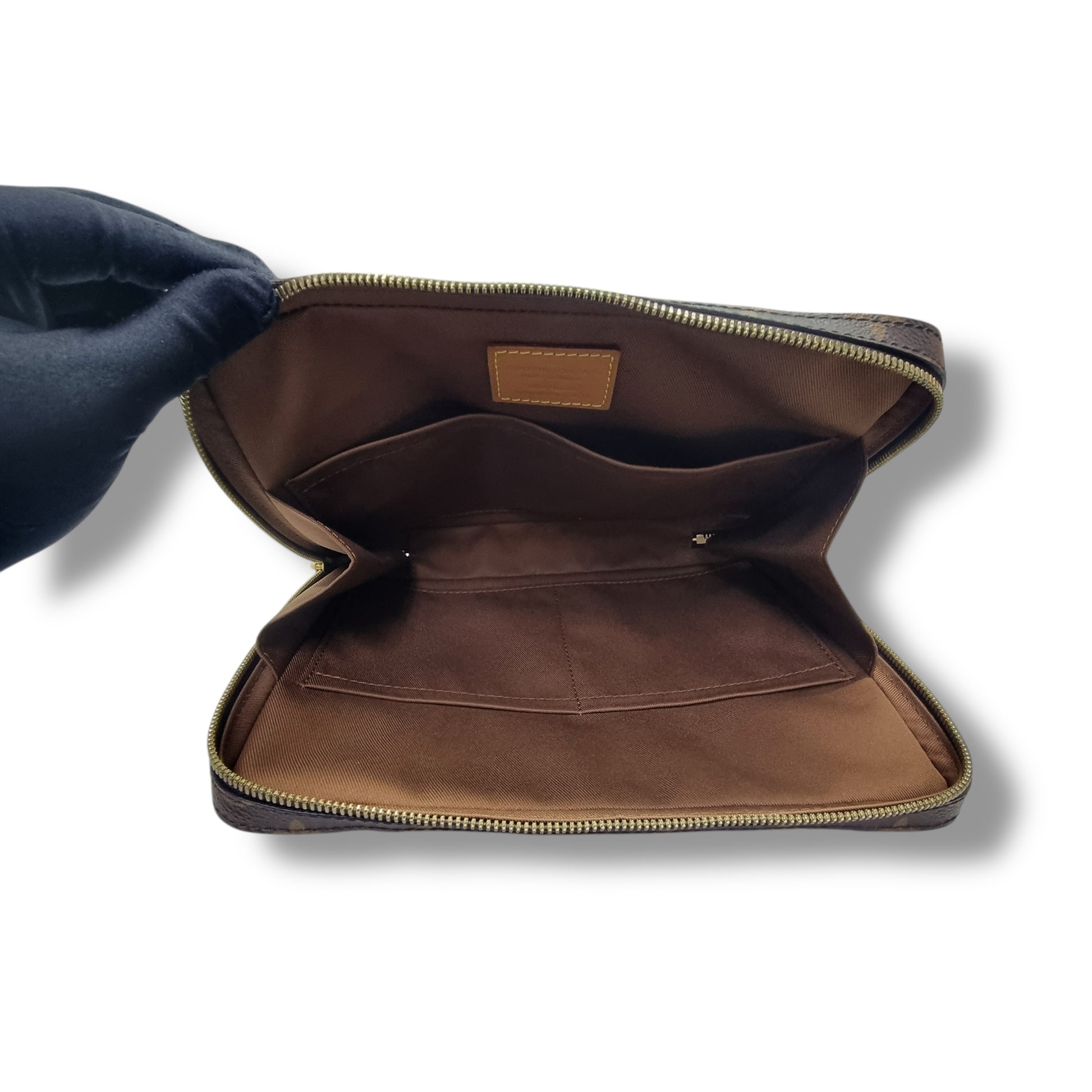 Exterior : The canvas is very clean and nice and hardware has no scratches remain bright. Leather shows little marks. Strap has minor creasing. Overall in very good condition with zip around closure.