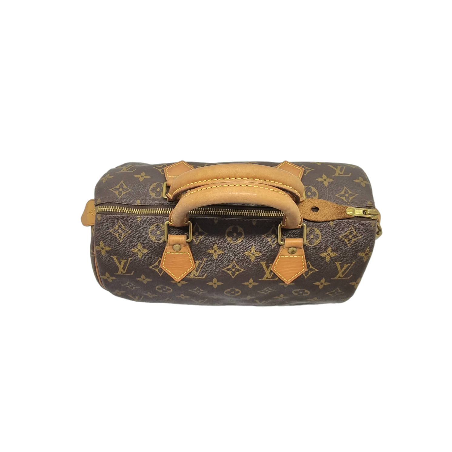 Exterior : The canvas is clean with faint signs of wear. The handles has faded and have some marks. Have scuffings and marks on the leather. The leather trim has scuffingsthroughout. Hardware has tarnished. Overall in good condition with double handles, top zip closure.