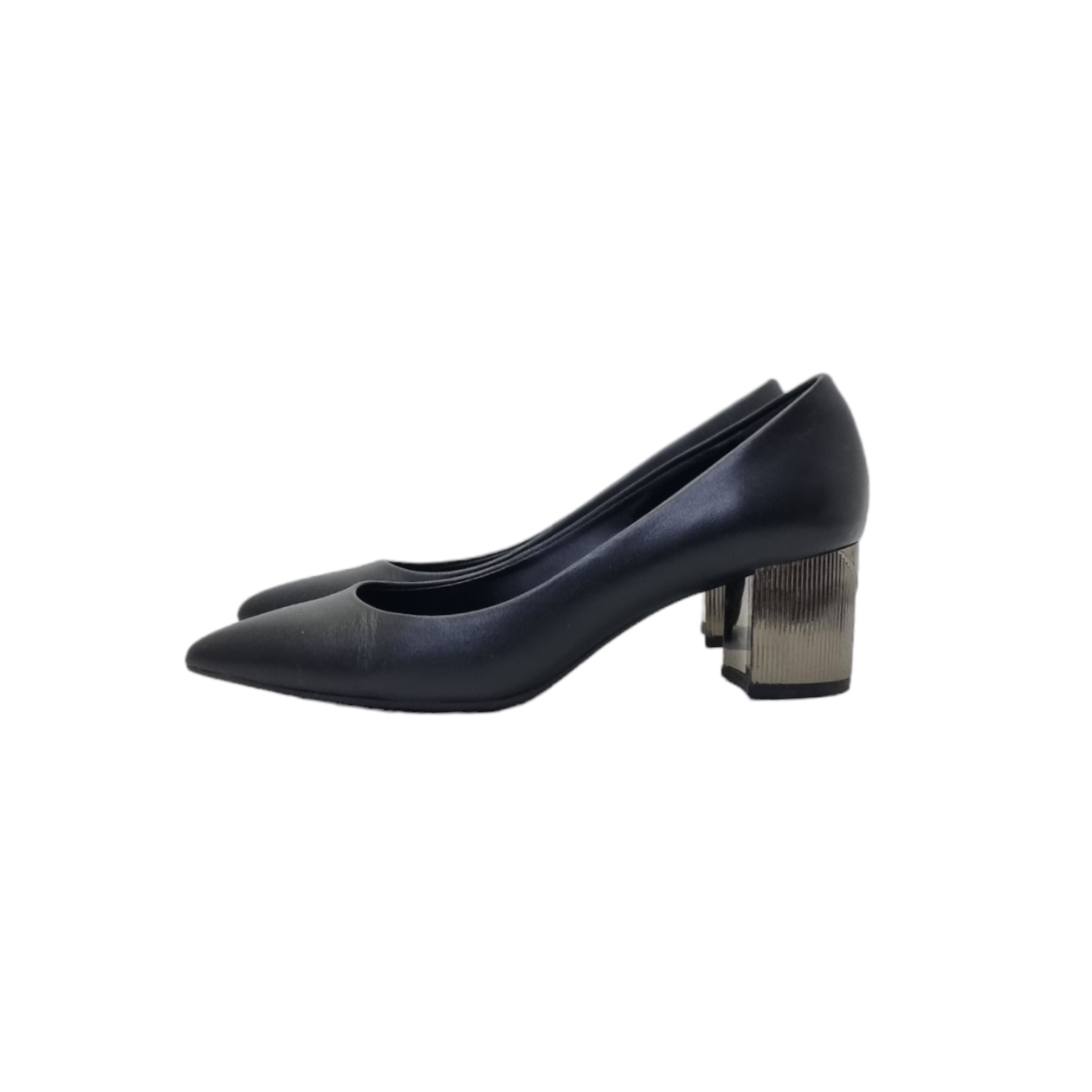 Exterior : Shows signs of wear in average condition with leather pointy pumps featuring grooved metallic heel, rubber soles.