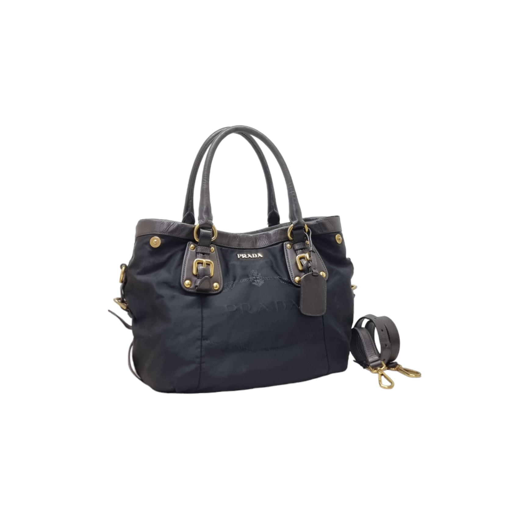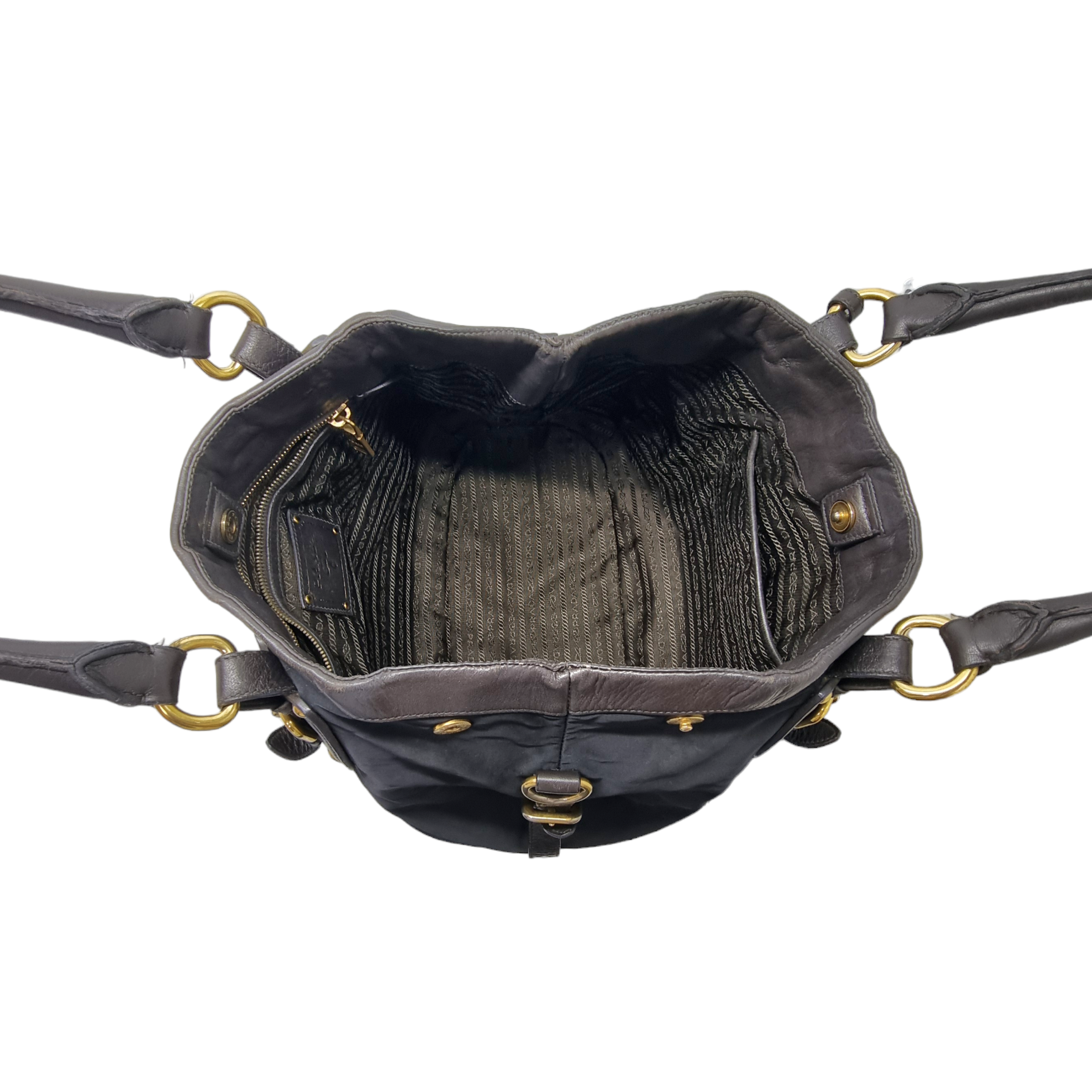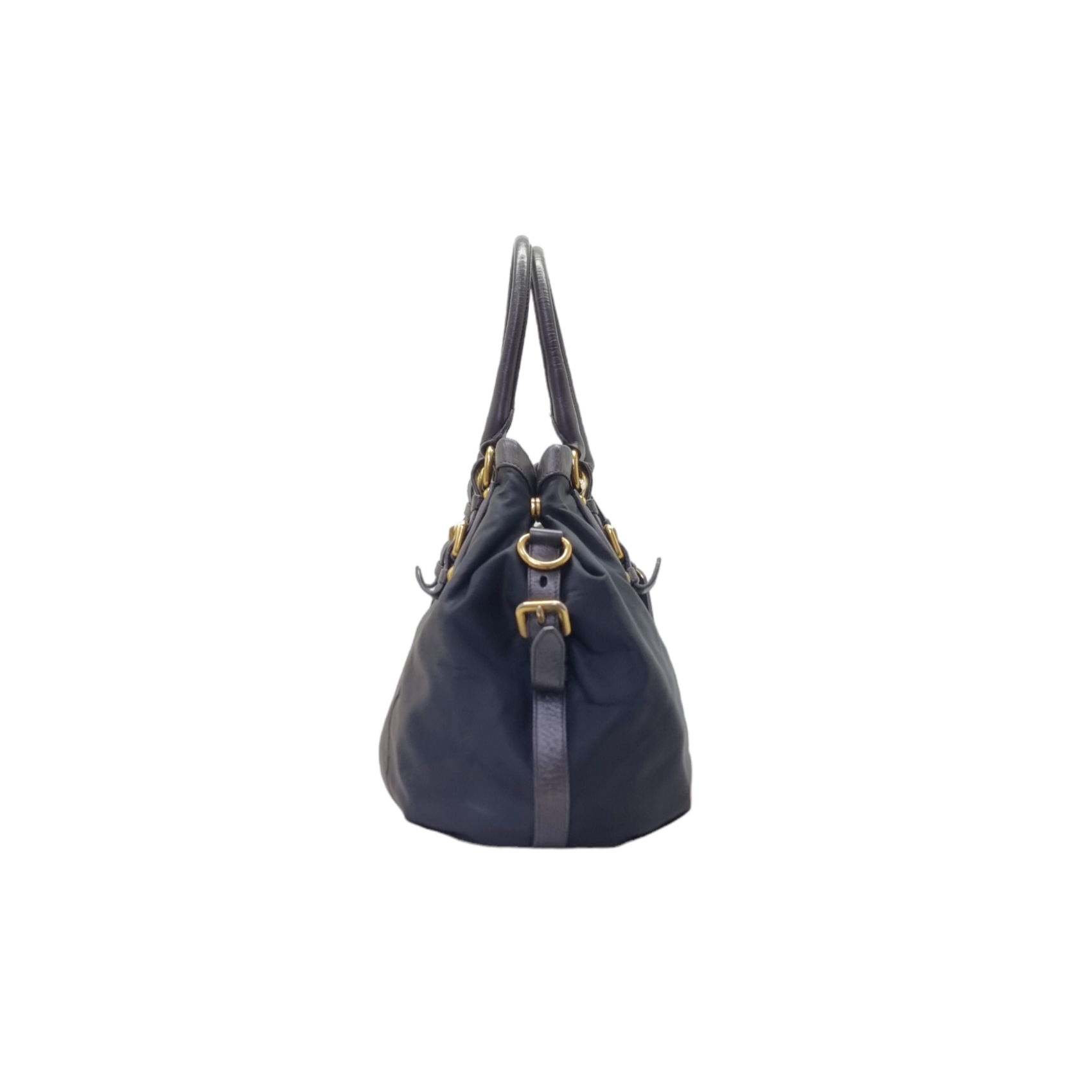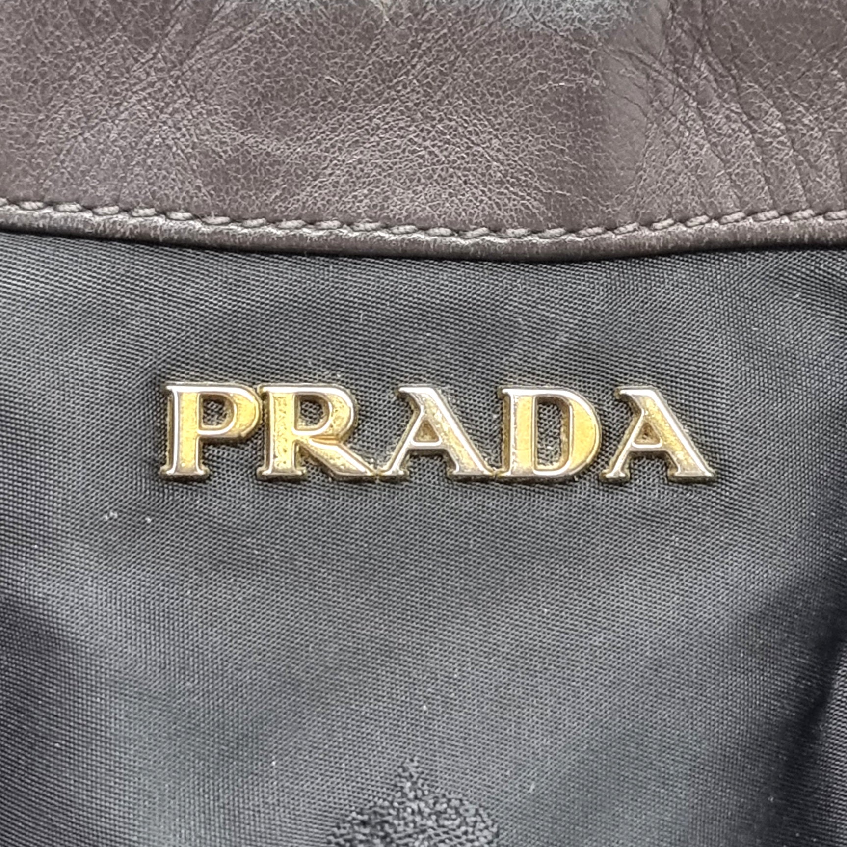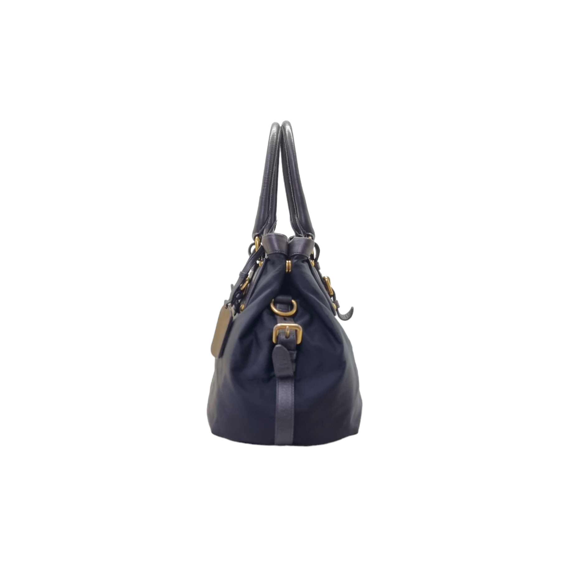 Exterior : The nylon have some minor mark and rubbing. Some parts of hardware have color fading. The leather along the opening and handles have scuffings and creasing. Overall is in good condition snap button closure, double rolled handles and side snap button for extension.