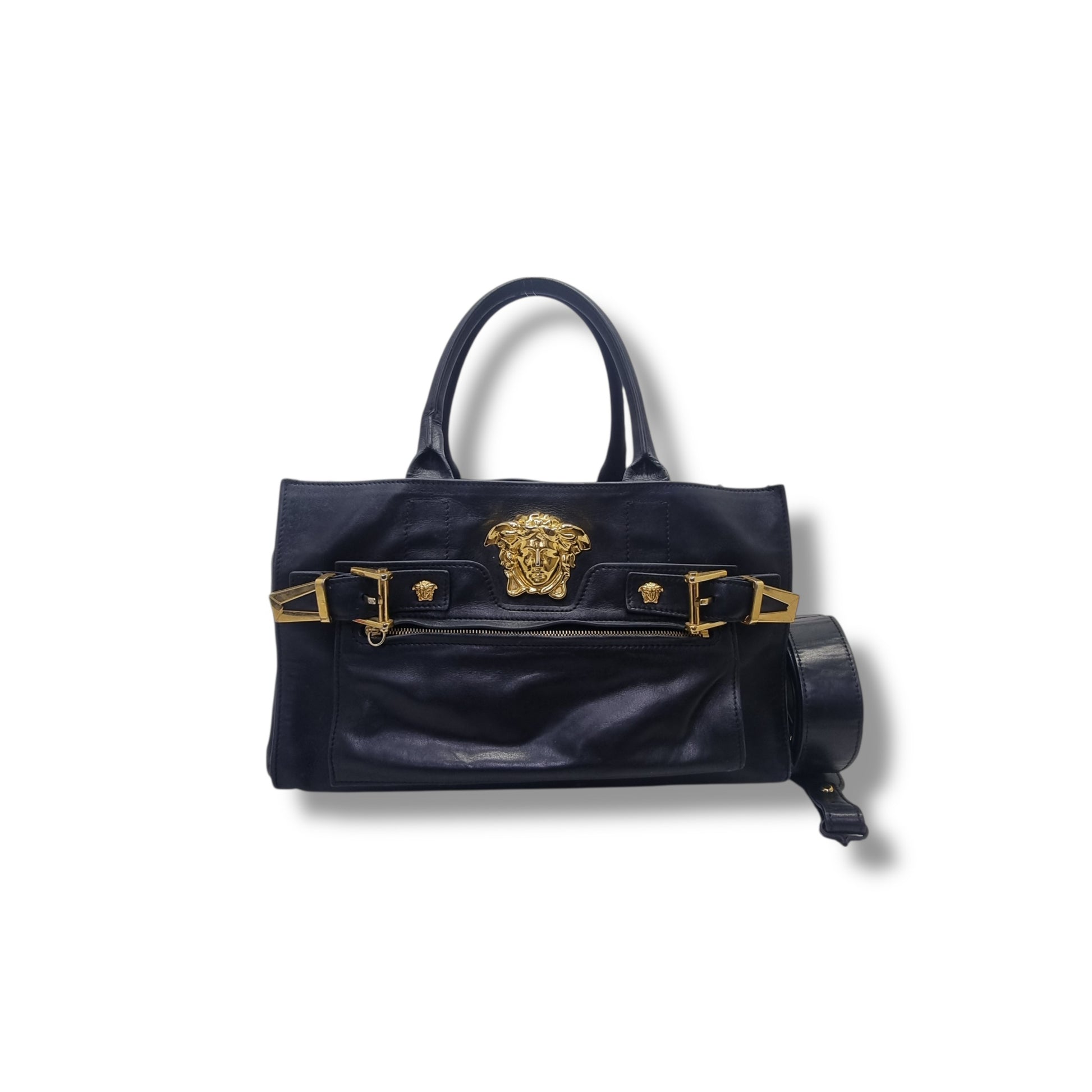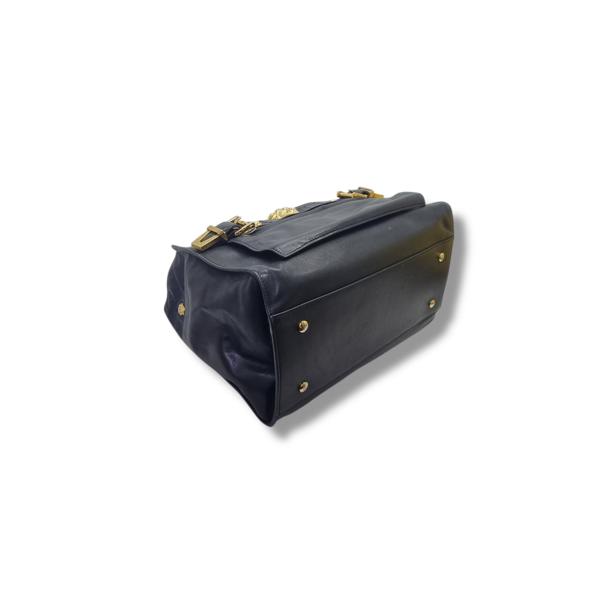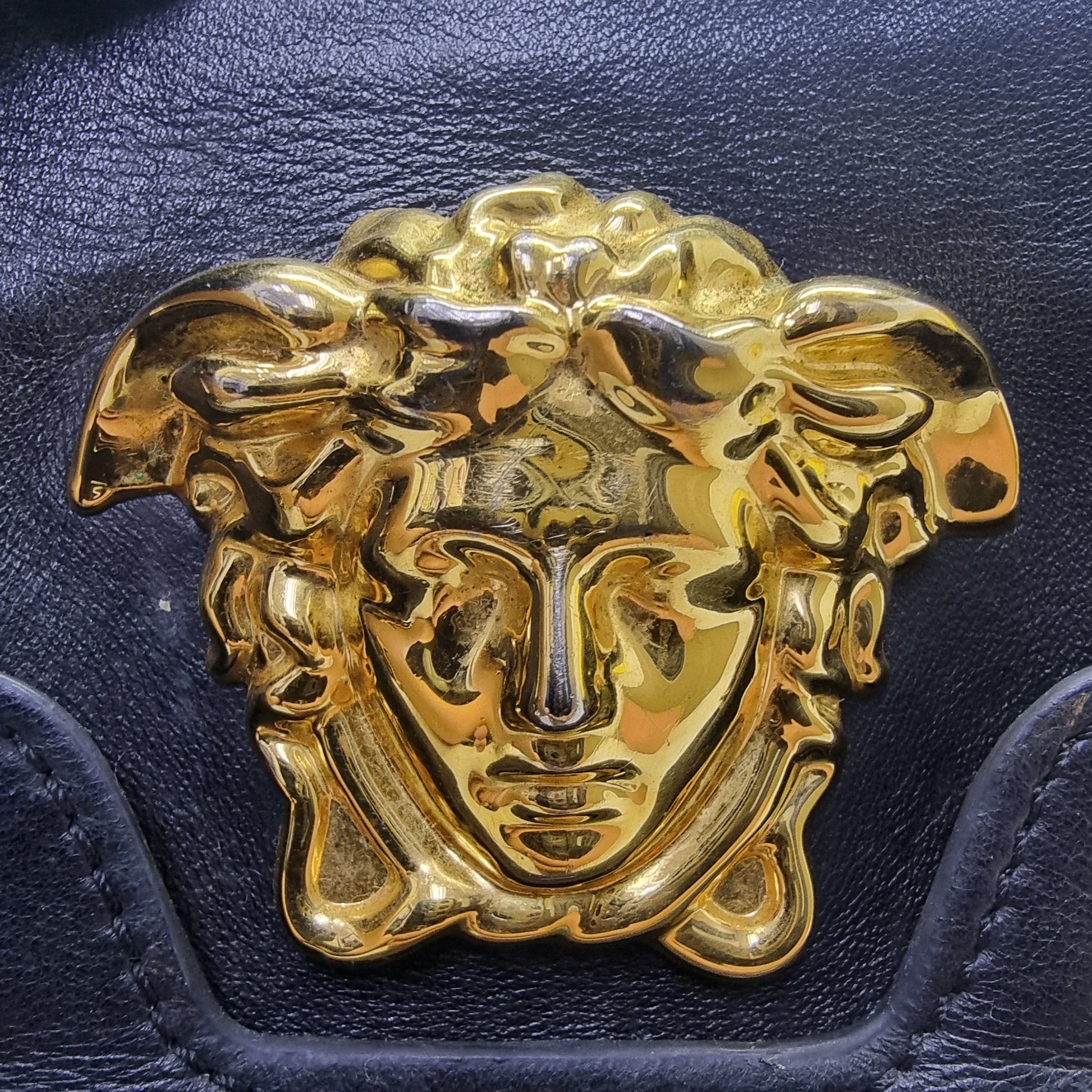 Exterior : Shows flaws on the leather with scratches, scuffs and marks. The corners has scuffings. The hardware is still bright but some parts has faded. The double rolled handles has slight scratches with holes. The strap has creasing. Generally in average condition with gold-tone Medusa detail, front zip pocket and double gold metal buckle and magnetic snap closure.