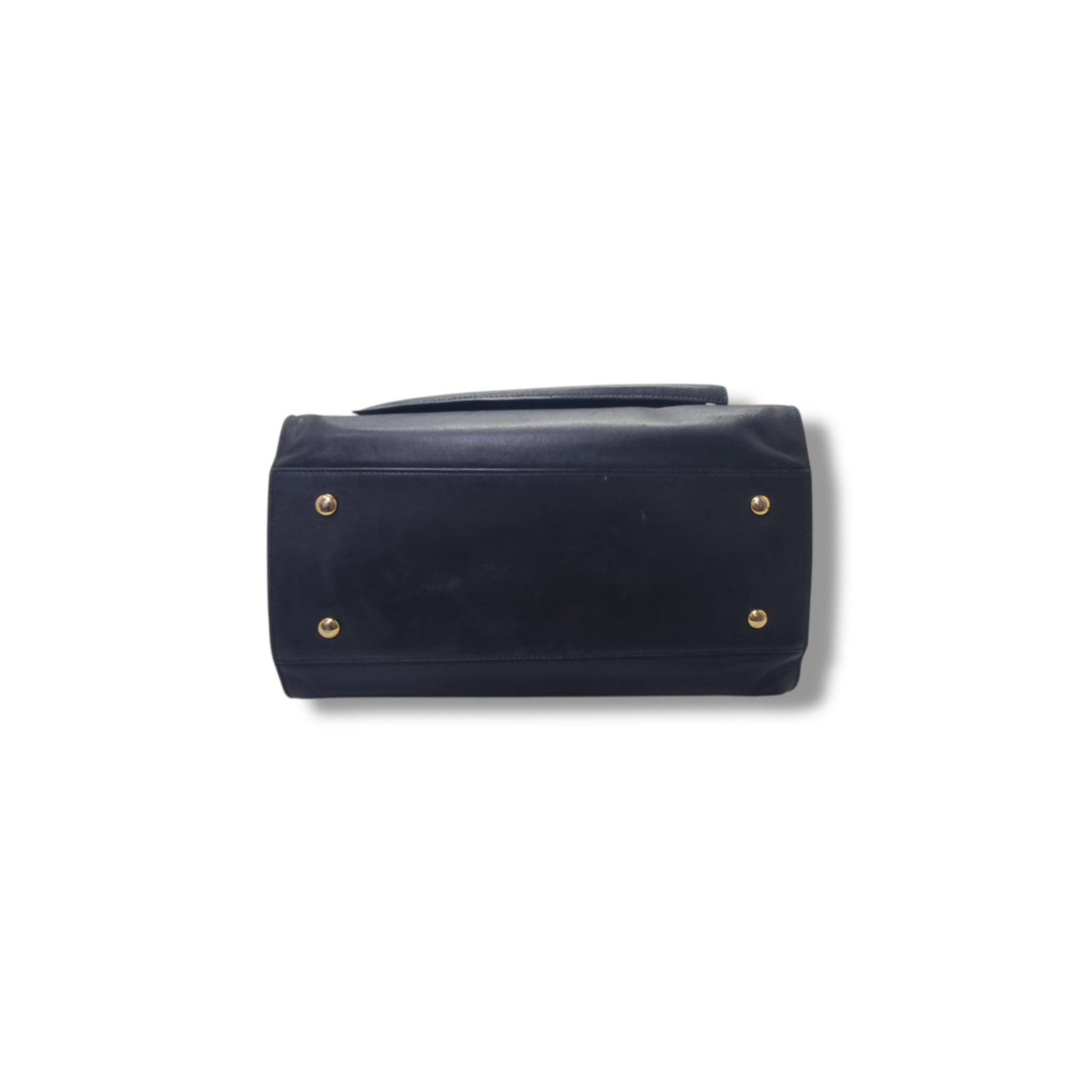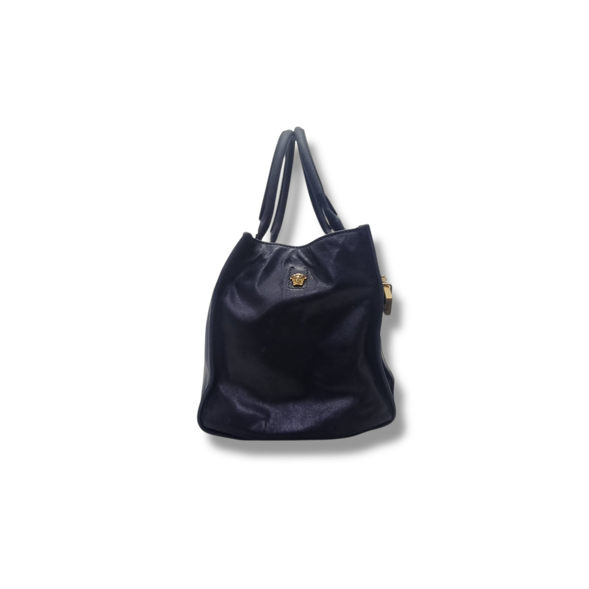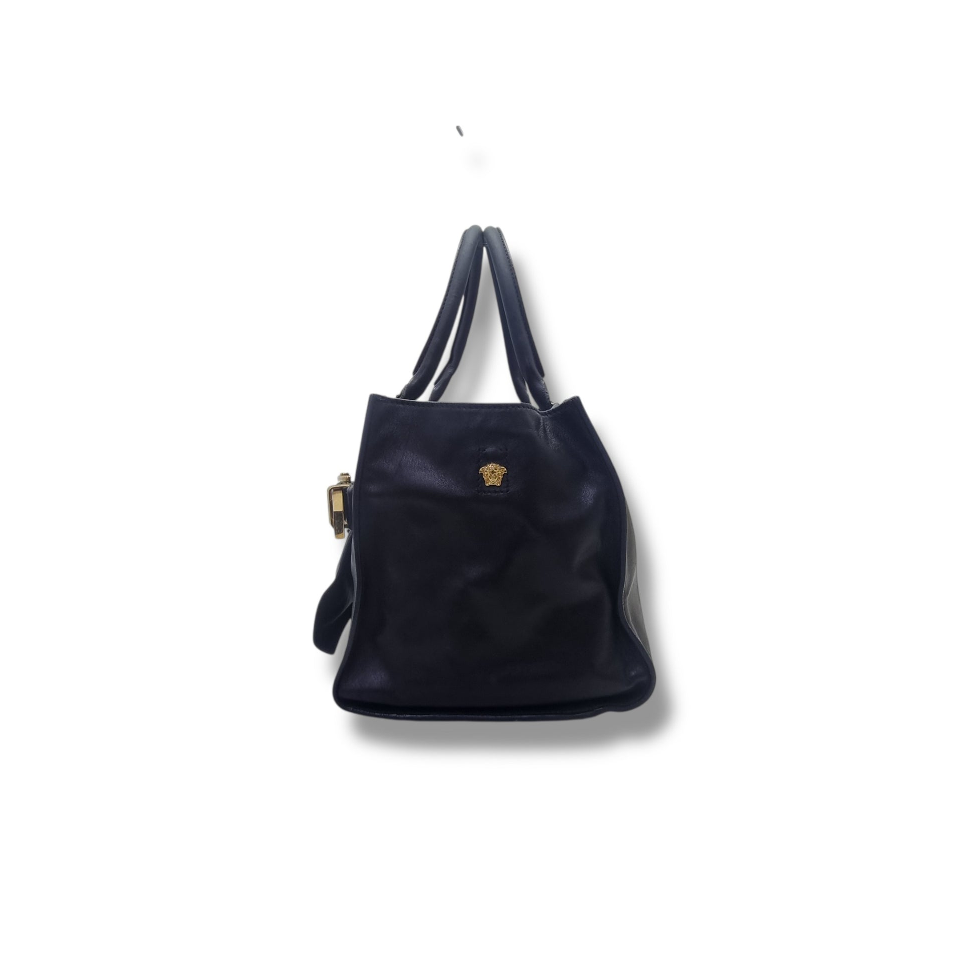Exterior : Shows flaws on the leather with scratches, scuffs and marks. The corners has scuffings. The hardware is still bright but some parts has faded. The double rolled handles has slight scratches with holes. The strap has creasing. Generally in average condition with gold-tone Medusa detail, front zip pocket and double gold metal buckle and magnetic snap closure.